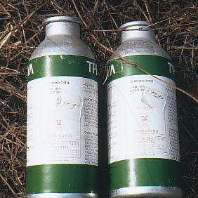 (2,4,5-T) each year from 1980. Some of the cans of herbicide used are shown to the left.
