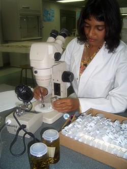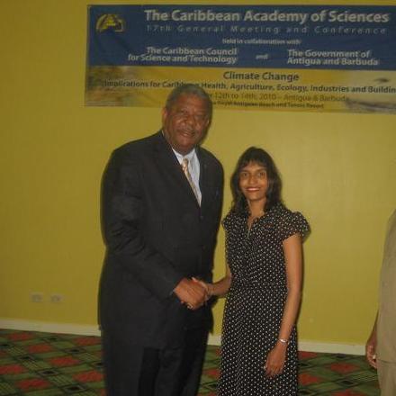 Jo-Anne Sewlal collecting a spider in Nevis; examining specimens in the laboratory; receiving the Caribbean Academy of Sciences / Third World Academy of Sciences Young Scientist Award 2010 from the Prime Minister of Antigua and Barbuda the Honourable Baldwin Spencer, 17th Caribbean Academy of Sciences General Meeting, St. John's Antigua, November 2010.